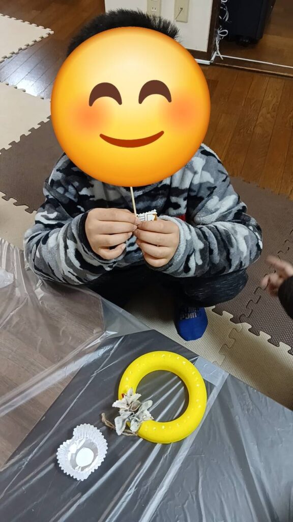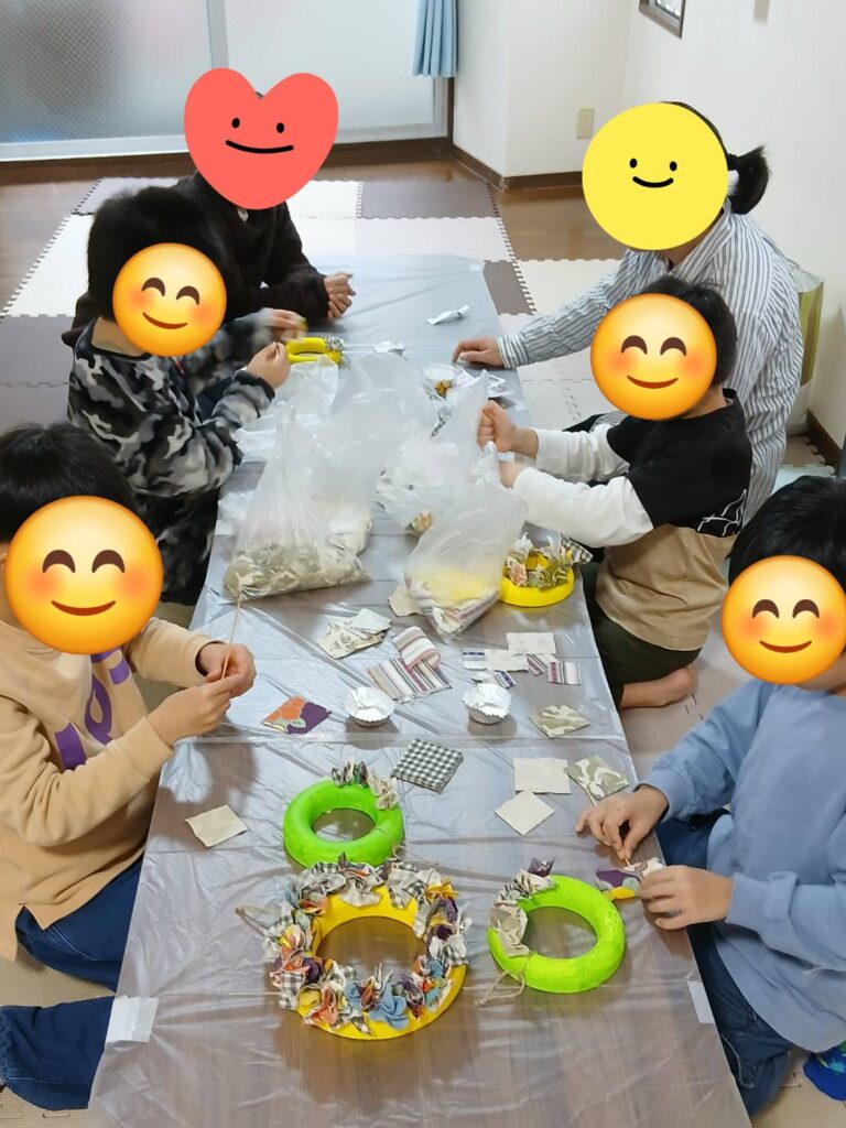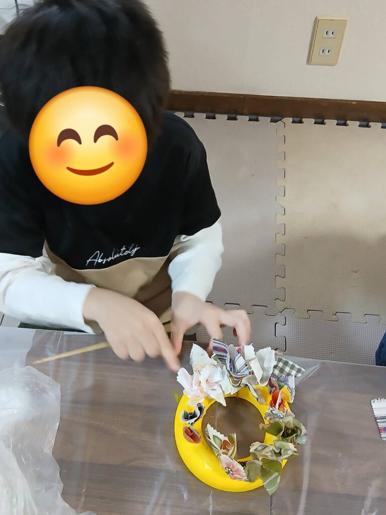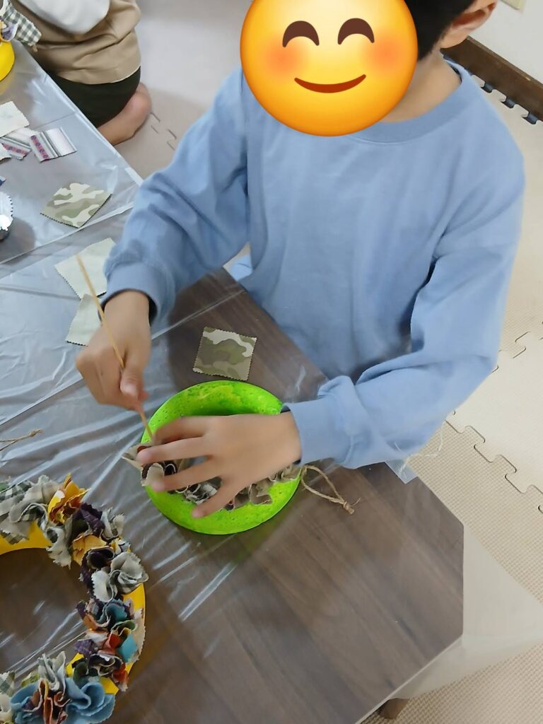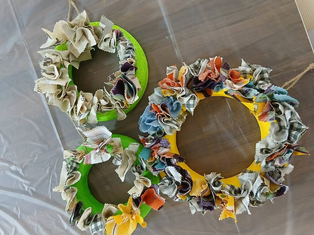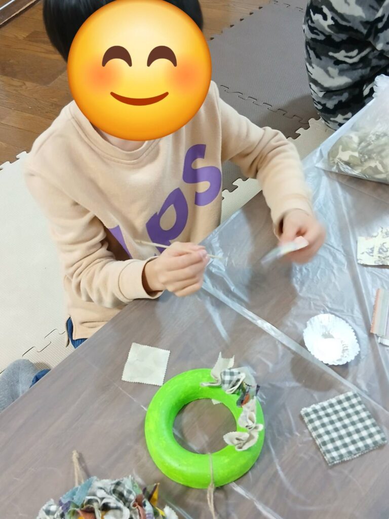みんな上手に布をリースにつけて綺麗に作れていました。